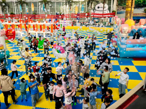乐园内玩法丰富多样,充气城堡的跳跃乐趣、巨型积木的创意搭建、海洋球池的缤纷遨游、沙池的寻宝探险等10余项游乐项目,涵盖动静皆宜的游玩体验,满足不同年龄段孩子的喜好。更值得期待的是,定期举办的烟雾泡泡秀如梦似幻,五彩泡泡在灯光下飞舞,引得孩子们追逐嬉戏;机器狗巡游自带萌趣特效,灵活的动作与互动表演,让现场欢声笑语不断。